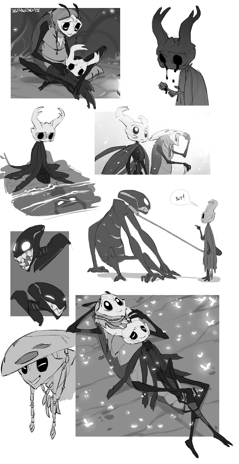 This time I only did some little sketches. Quirrel are really trying to care of the little hollow knight. Being a tough knight isn’t easy :3