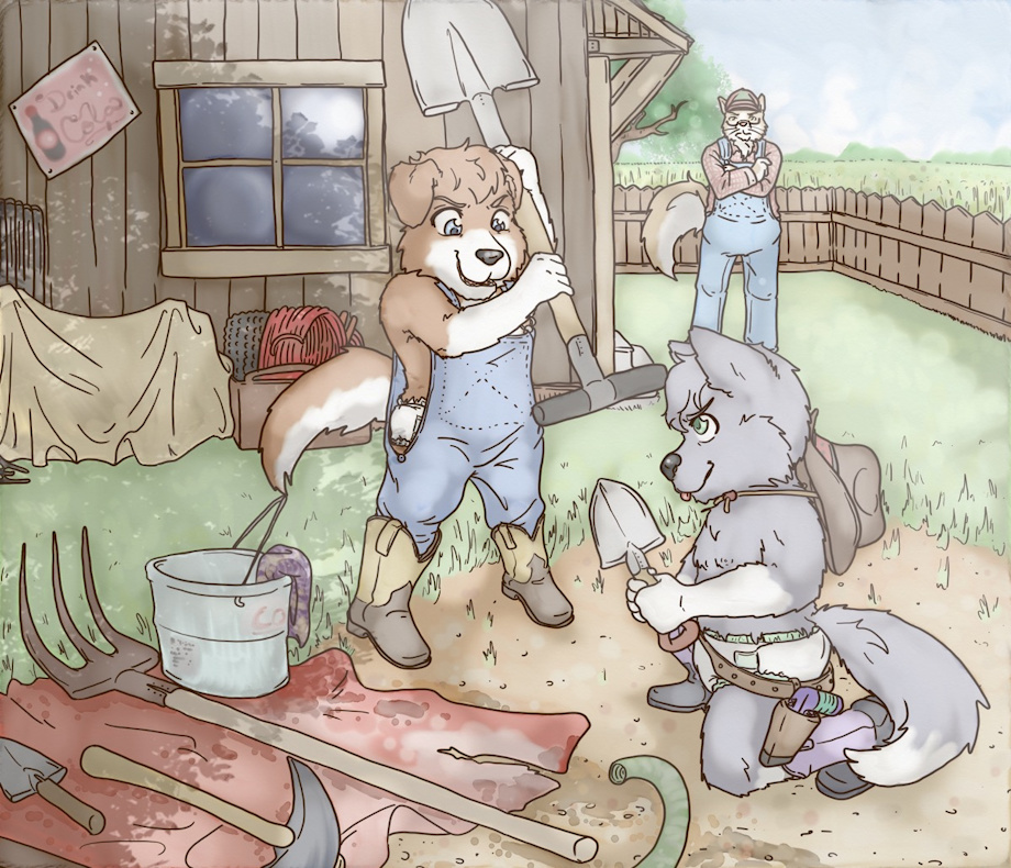 "No sir, you know how this goes." said Evan as he pulled the furbrush from the back of his overalls, "I used to have a paddle, but got rid of it when my pups left home. I guess this will have to do for today.