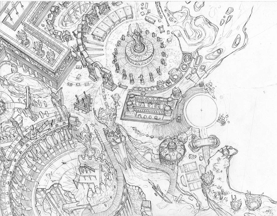 One of the most complex things I've ever drawn- greatly anticipating how it will look with some cascading light falling across the scene.
