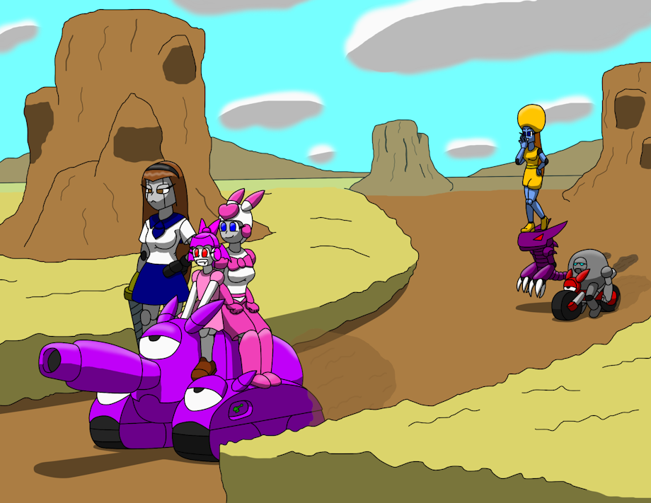 A quick premise to it would be, the trio on the tank are our protagonists, they go around helping other cyborgs and androids with their problems along with fighting off an evil force of robots that want to take control of the world. the four robots following them are agents of the evil robot organization, how one is as bright as a dim bulb and the other is too concerned with her polished appearance.