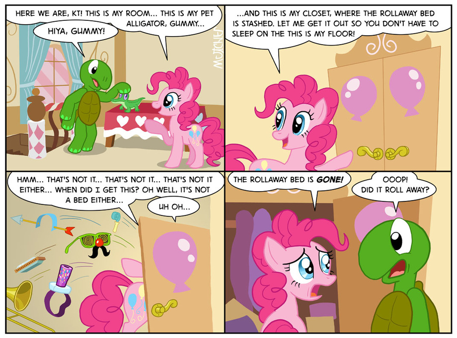 After KT's first day in Ponyville, the ponies discuss with him the issue of where he'll be sleeping.
