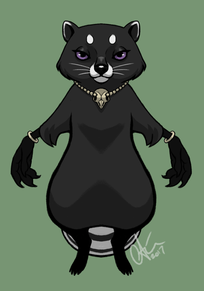 Gomi is a melanistic Tanuki, meaning they possess a mutation that causes most of their fur to be dark or black. Otherwise, they are a fairly typical representative of their species, being rather short and stout, with beady eyes and a small but pointed muzzle, short, fluffy tail and small, rounded ears.