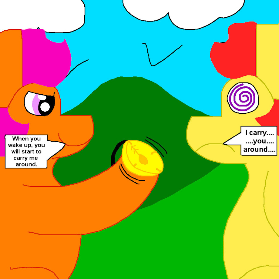 Apple Bloom gets hypnotized into carrying Scootaloo as requested by YangIsCool on deviantART.