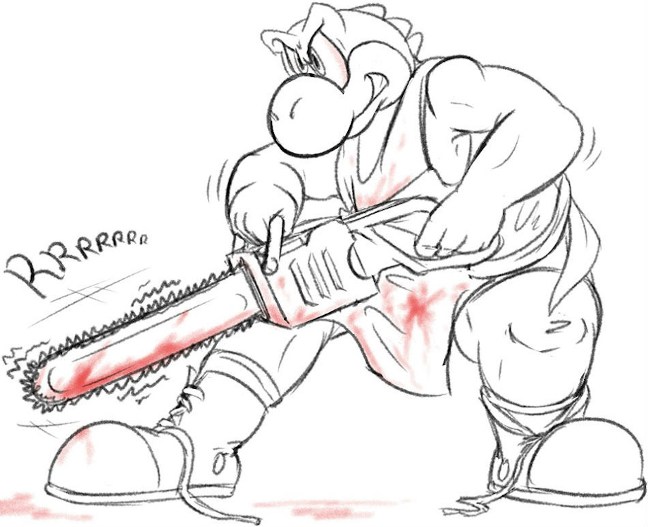 Showtime with a bloody chainsaw, enraged for some reason. With that butcher's apron it seems like he's channeling his inner Leatherface. Though if he doesn't tie his shoes, he might end up dead like that one guy from Hostel.