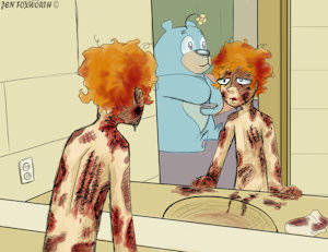 Flug went into the bathroom and looked at himself in the mirror. A mess would be an understatement, in fact, I should probably be in a hospital right now, he thought, I'm lucky the boss didn't use his venom, or I'd absolutely be dead by now. God dammit, he hated mirrors, he thought, for one he didn't like his appearance, and for two Black Hat often found it hilarious to manifest FROM mirrors to scare the shit out of him. He ran a hand through his curly red hair, which was matted with blood. Ugh. As if he didn't have enough scars from his accident with the lab fire... Man I hope these things will heal up if I wrap them up properly, I probably need stitches or something, but I can't do that. He daren't check into a hospital. They needed to disappear, which was hard enough since he had taken the company van, the shrink ray shipments, 5.0.5., and all that money. He knew Black Hat would probably still find him, but he couldn't help but try to escape, he wasn't giving up yet.