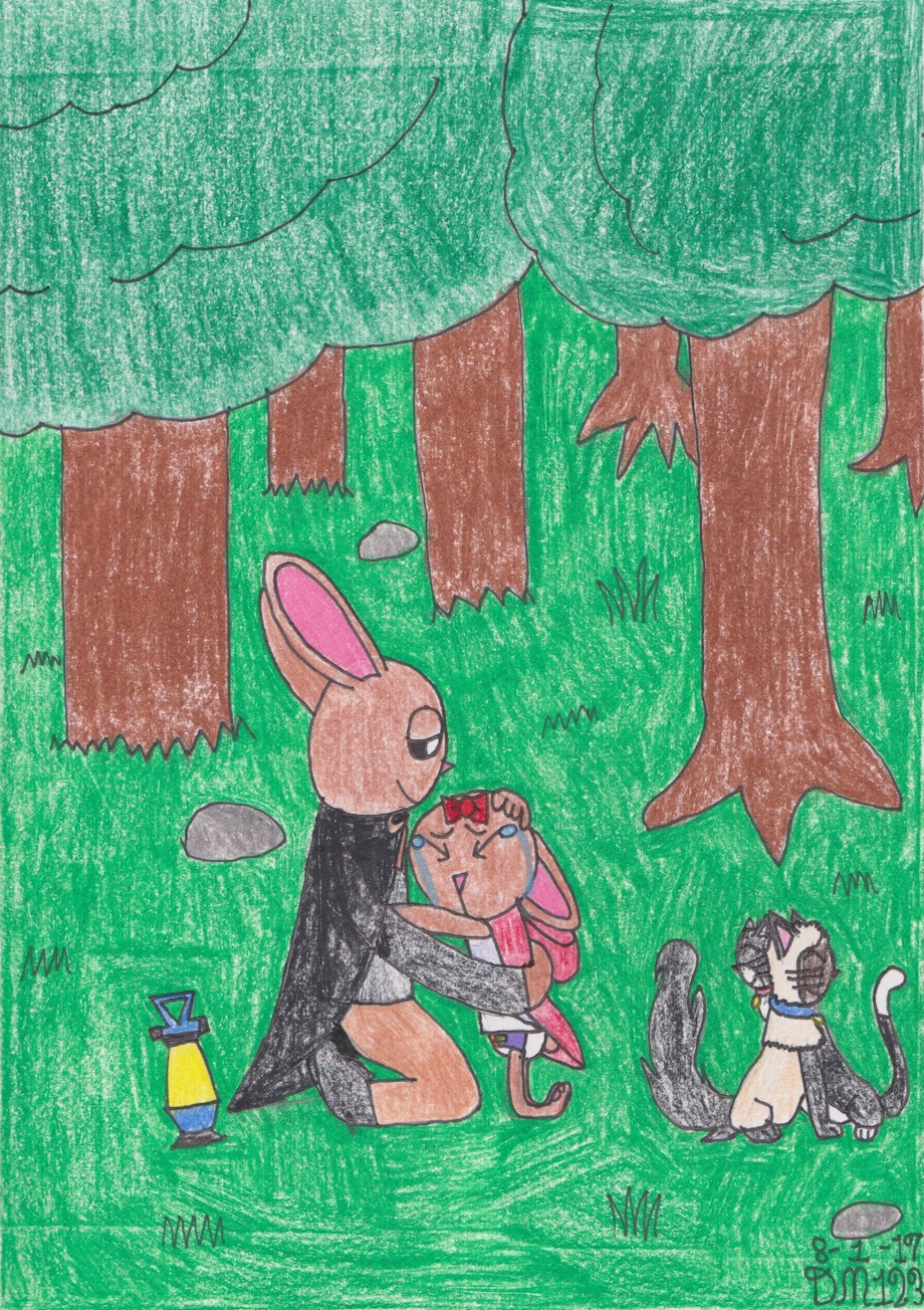 Just when hope was thought to be lost, Amy heard a voice. It didn't sound like a scary voice but a familiar voice. Stan hears it too. She got up and walked out of the hollow tree trunk and followed the voice. She then saw a light. She glared at it and saw an image of someone. It slowly fade in and turned out to be Kai. He was looking for his sister along with Stacie who was also looking for Stan. Amy tearfully shouted "Kai!" and ran up to him. Kai hugged his sister while Stacie was snuggling up with Stan. Amy still shaking in fear hugged in tightly as she begins to cry. Kai then calm her down by patting on her head gently. "Shhh! It's okay Amy! You're safe now. It's alright." said Kai. Amy stopped crying and looked up to him with tears in her eyes. Kai then wipes them off. "Come on girl. Let's get you and Stan back home safely." says Kai as he picks her up and carries her in his arms as he wraps her in his cape to keep her warm. He along with Stan and Stacie walked immediately out of the forest and then safely back home.