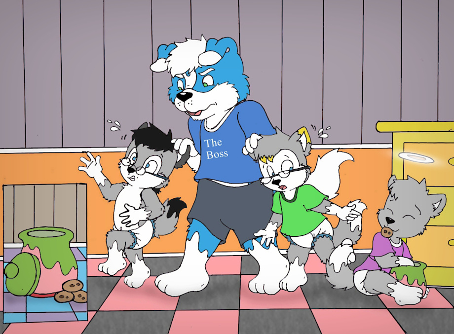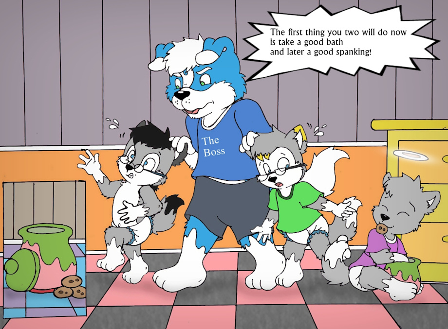 The boss took Loupy and Ace by their ears and said aloud:"Naughty pups!The first thing you two will do now is take a good bath and later a good spanking!"
