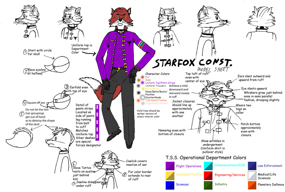 Reddish-Brown/Russet main fur color with a White countershade, Black "gloves" and "boots", a Black "cross" on his back extending from the base of his skull to the base of his tail and down the backs of his arms to the gloves, White tip on his tail, Fluorescent Orange curved checkmark behind his left eye (high tech slave tattoo), a scarred patch on his chest just left of his sternum, and other, lesser, scars at various places on his body. Bionic right hand concealed by a synthetic fur glove. Six prominent whiskers on muzzle just behind nose.