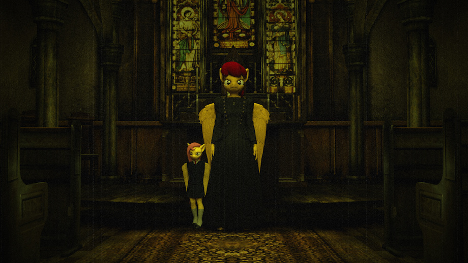 Got here a Silent Hill type of pic featuring Scoots and her biological cult mom. Two versions as well, one as a normal render, the other with some old timey photo aesthetics to it.