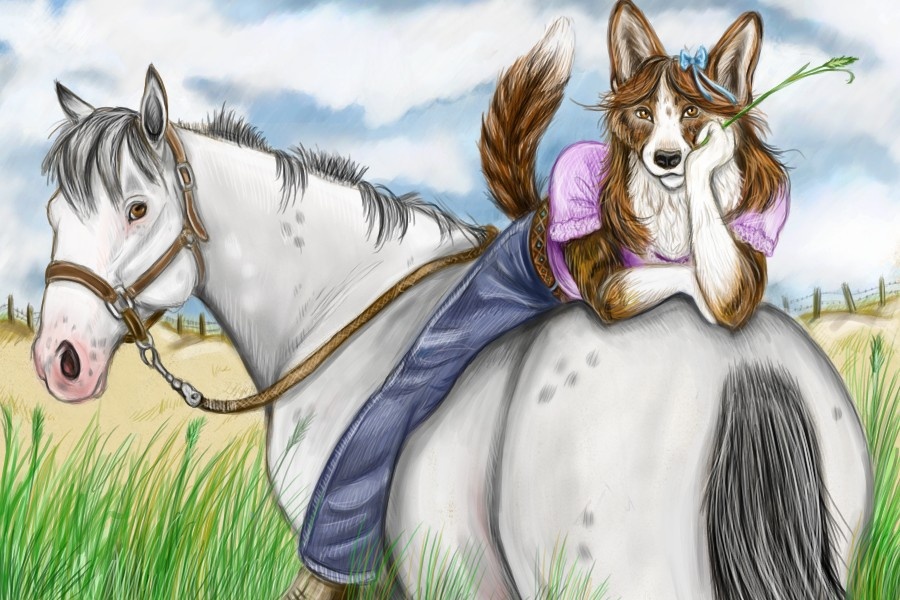 Tess the Cardigan Corgi ranch-girl, and her trusty been there done that mare Jewel.