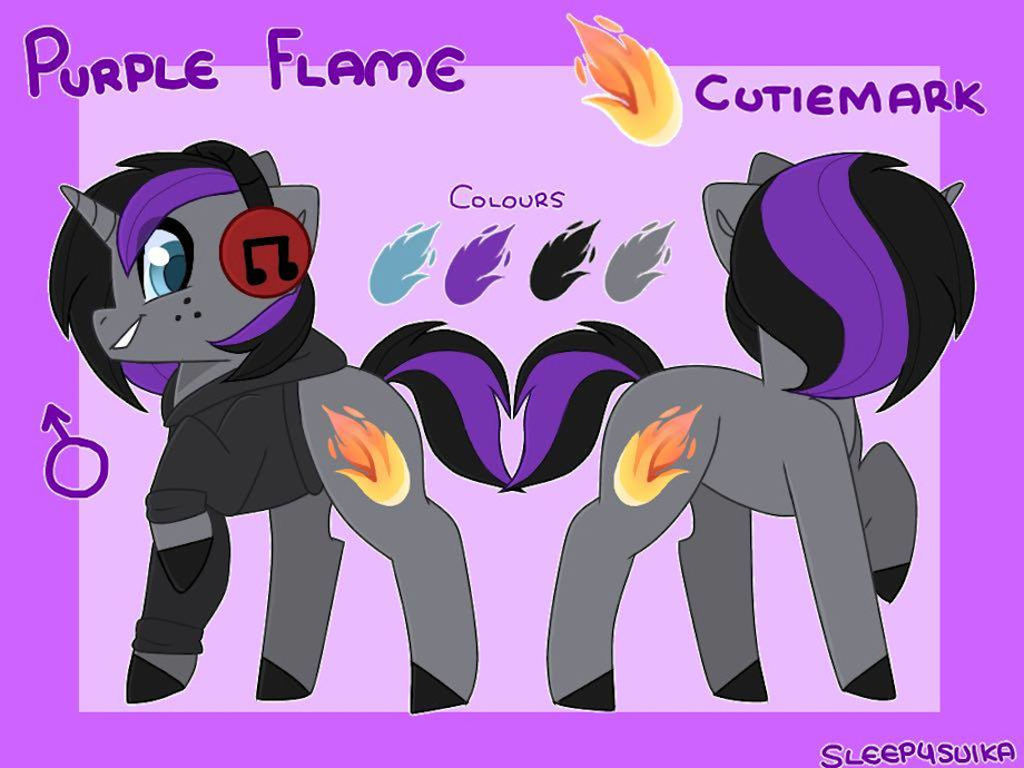 Grey pony with black/purple colored mane and tail, wearing a pair of red headphones as well as a grey hoodie. Hooves are black and eyes are a light blue color. Cutiemark is a flame symbol