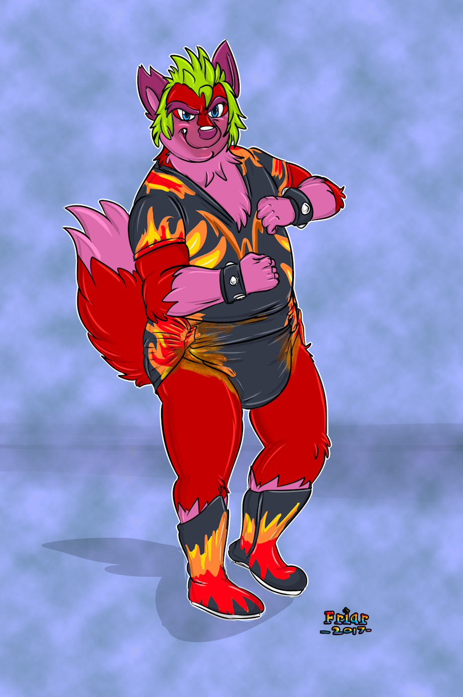 Berry's Dad, Wildberry Pi Sr, wrestles as "Wildfyre." His stats are: height 6'4" / 193 cm / weight 390 lbs. / 176 Kg, and he's 32. Rather than wearing the standard wrestling trunks, he's chosen to wear diapers in solidarity with his incontinent kit, Berry Jr. That doesn't mean he's beyond using them in a pinch...