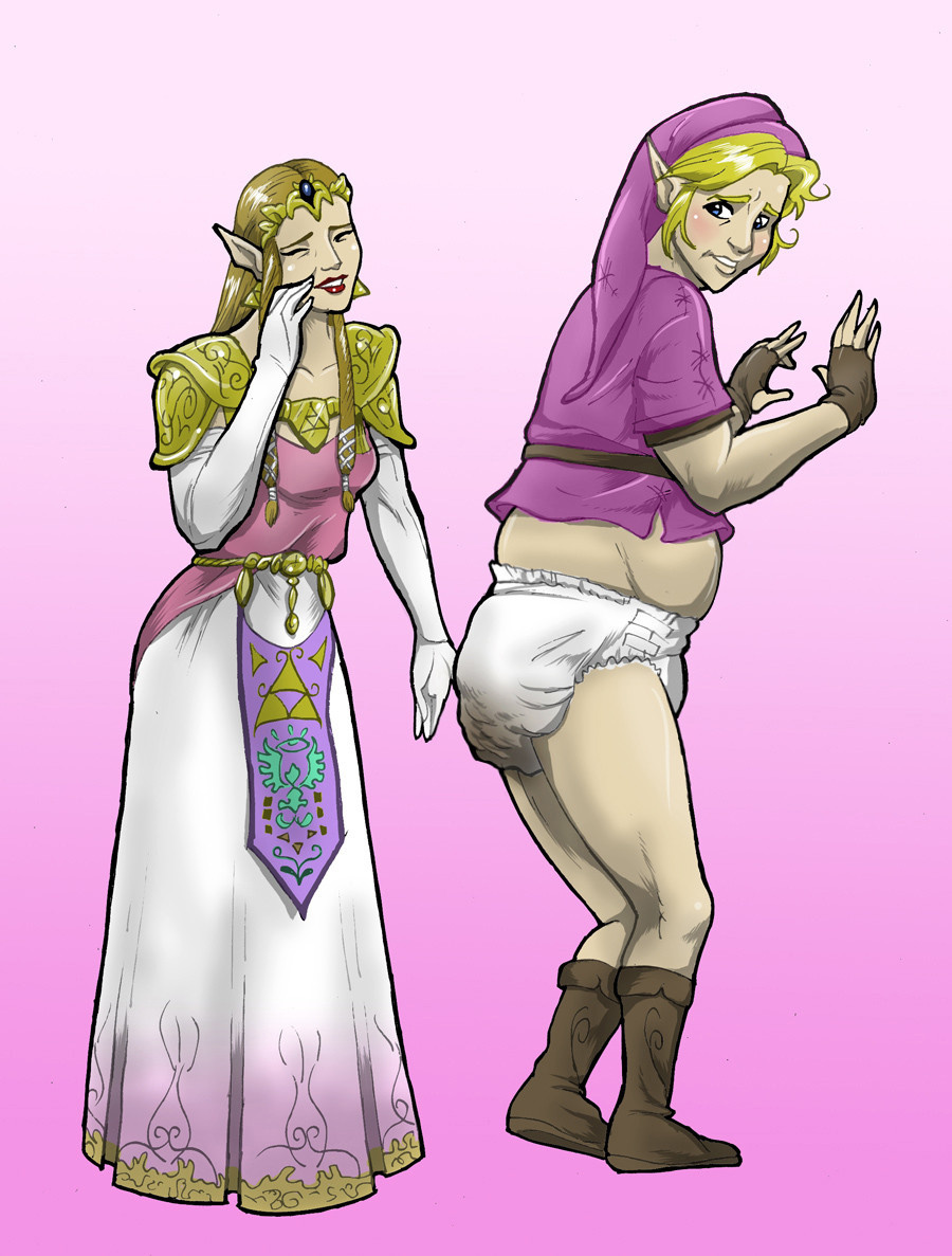heh.. So since volah prefers to have chubby sissies poor link now ponly ends up stinky diapers and a less then heroic coloring of his costume.. looks like he put on a few pound. (Much to zeldas amusement) Poor link.. wonder why he's in the diaper.. maybe he was just so weak the princess put him back in diapers or he's such a sissy now he needs them.. either way he's proving he belongs in them!