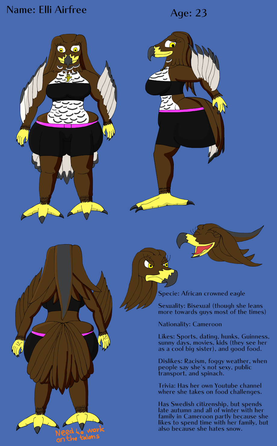 Originally so did I intend her to be an eagle, but thinking about it so wasn't I sure if she really looked like an eagle enough, so I had to redesign her. I'm even basing her on a crowned eagle, a species that exists in Africa.