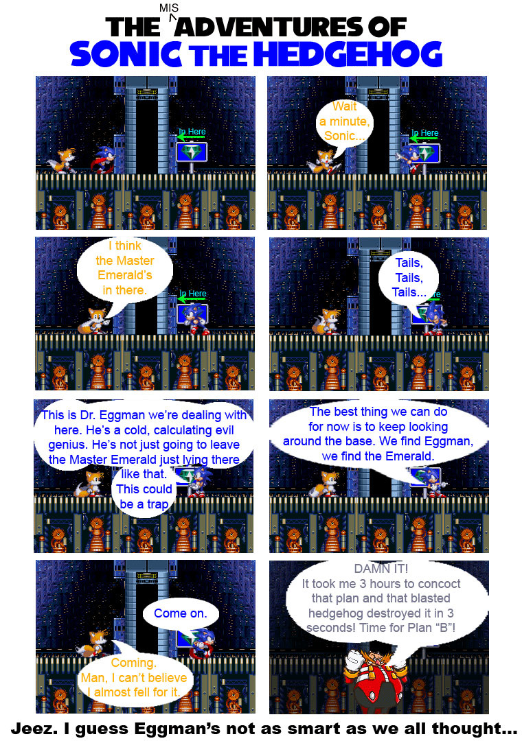 The first few ones had characters motionless, sprites at a random size, speech bubbles all over the place and not in order, and text so big, it barely was able to fit in the bubble. I also added random images from Yahoo to this and made pretty dated television references. This was also made, and I know this is going to be hard to believe, before I became I SonAmy fan. Shocking, right.