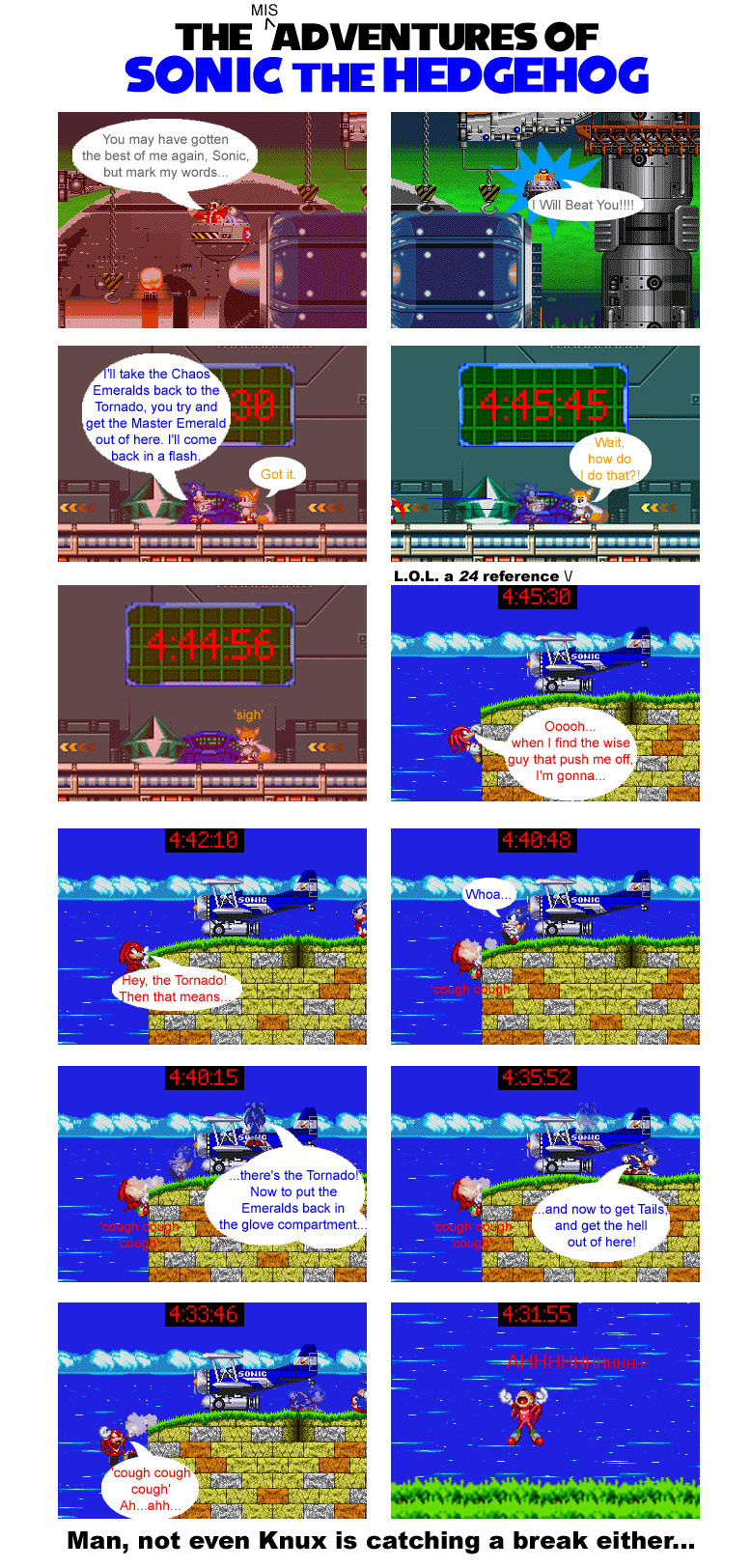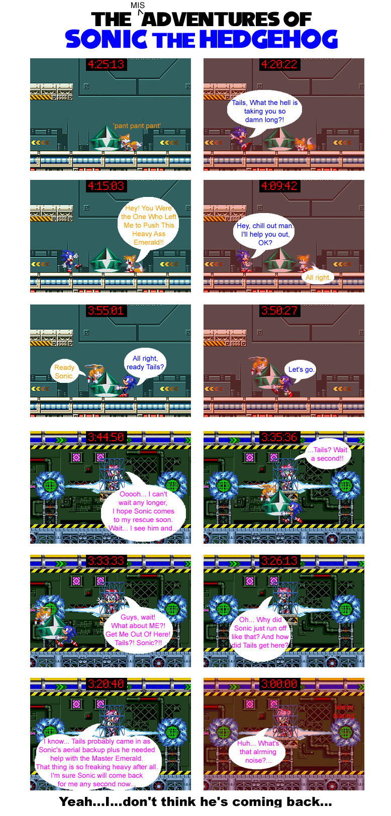 The first few ones had characters motionless, sprites at a random size, speech bubbles all over the place and not in order, and text so big, it barely was able to fit in the bubble. I also added random images from Yahoo to this and made pretty dated television references. This was also made, and I know this is going to be hard to believe, before I became I SonAmy fan. Shocking, right.