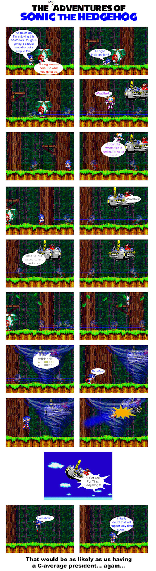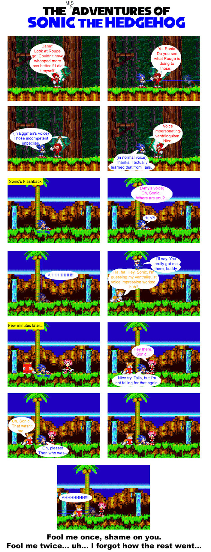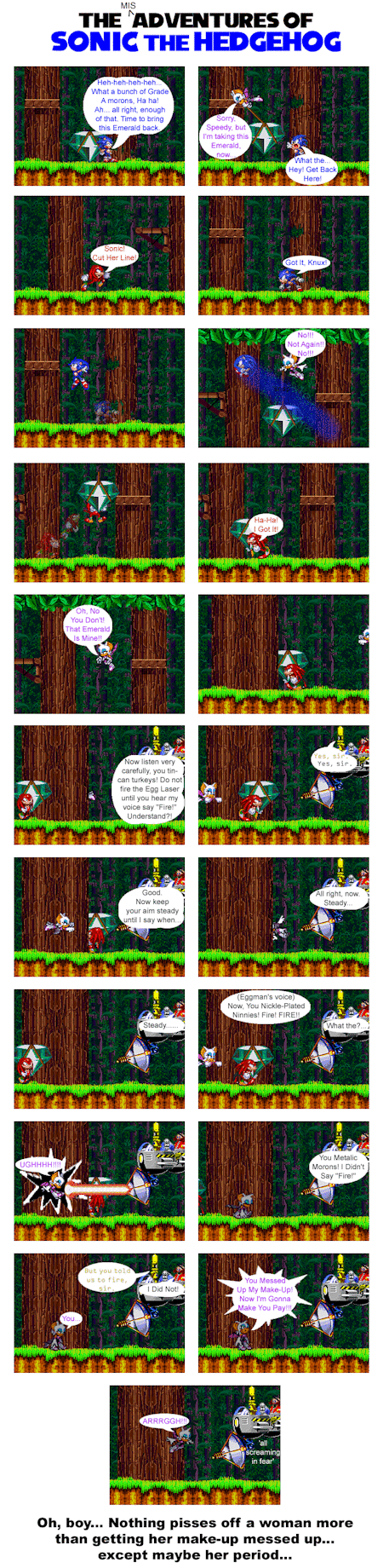 In the beginning of this one, you tell I was starting to warm up to the idea of Sonic and Amy. This one was pretty fun to make, especially since I made more animated comics since the last issue. So, I never was a fan of the Knuckles/Rouge pairing, due to the fact that... well... she's pretty much a gold digger in this relationship. I tend to point this out and make fun of it in my series.