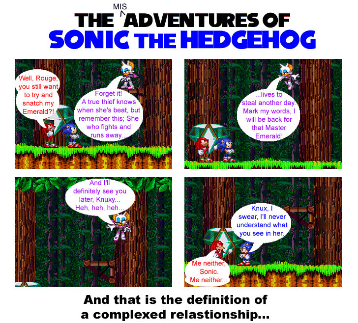 In the beginning of this one, you tell I was starting to warm up to the idea of Sonic and Amy. This one was pretty fun to make, especially since I made more animated comics since the last issue. So, I never was a fan of the Knuckles/Rouge pairing, due to the fact that... well... she's pretty much a gold digger in this relationship. I tend to point this out and make fun of it in my series.