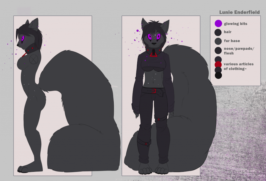 Lunie Endfield is a Fox-Based, Gender-Fluid (meaning she is whatever gender she wants to be at any given time) Ender, based mostly off of the Enderman from Minecraft. Like most creatures from the End, she is able teleport, but rarely does so, mainly using it to travel long distances quickly or to get away from something. Unlike other denizens of the End, she is actually quite friendly as long as you don't get her upset, though she can be quite playful and mischievous sometimes..