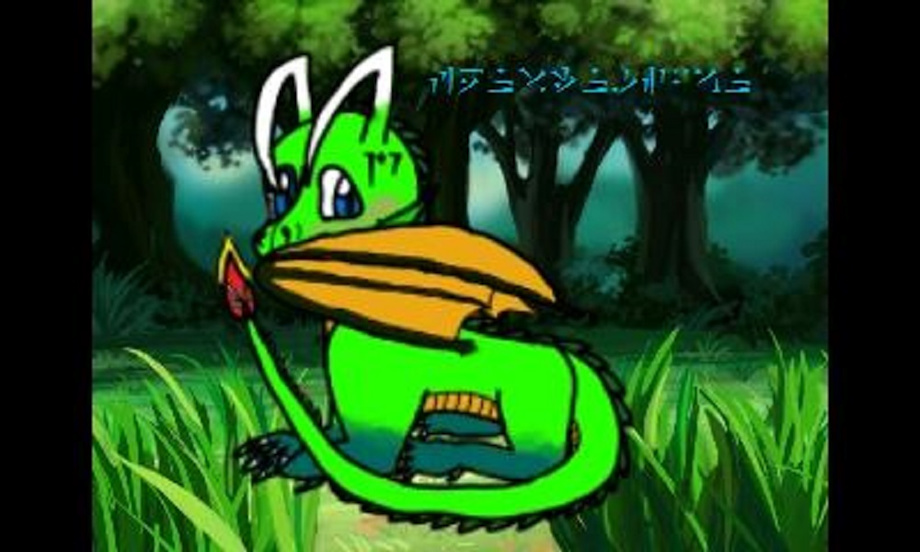 A green dragon with horns that point forward, a Thu'um glyph marking on his left forehead, cute blue harmless eyes, cheek frills that serve as his ears, Golden Wings and Underbelly plates. His chest plates run down from his chest to his tail. His scales become a darker green on his paws, and a feathery yellow and red tipped tail.