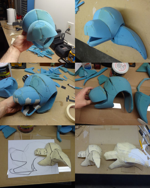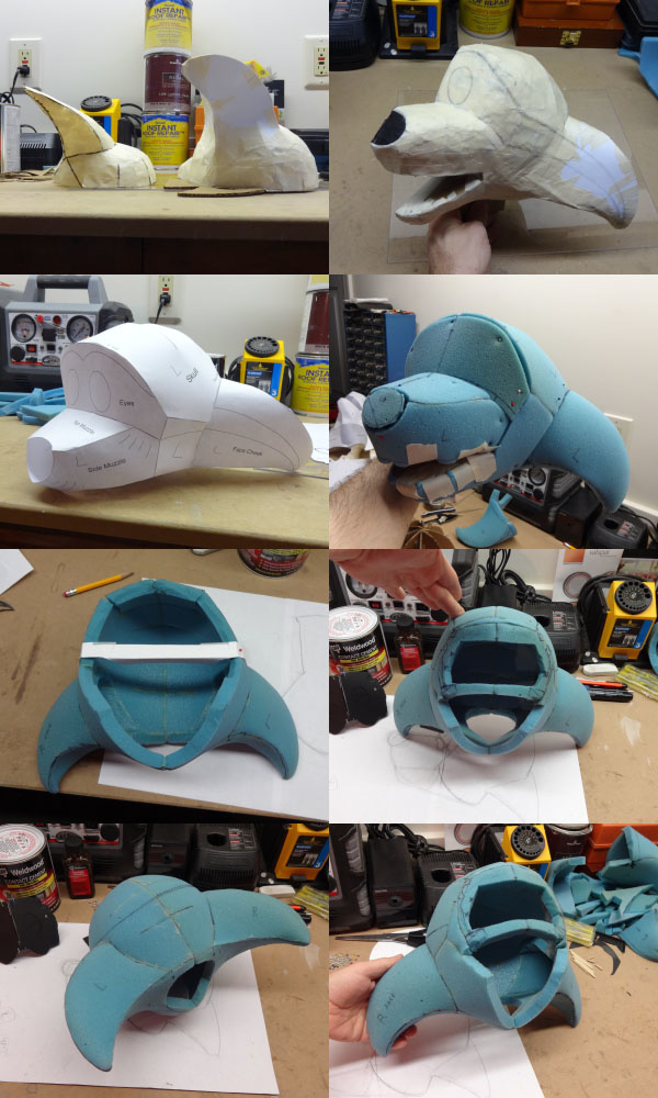 In the second collection, you can see many proportional improvements. After building the new foam form, I can see again that the muzzle is still not quite right. It was angled downward too much and is too long, but that can be replaced and I decided to repair the proportions of the head. It's much better, and I think this is the one I'm going to use. I'll make a new muzzle later after fitting the eyes. The head and faceplate have been greatly reinforced with mains electrical wiring and is actually a very strong structure, so I shouldn't have any trouble building a new muzzle and fitting it later. Why is there a hole where the eyes should be? A potentially clever/stupid idea, that's what!