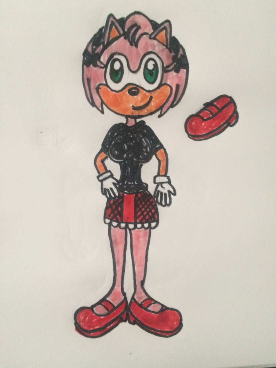 It's Amy Rose wearing an outfit the artist designed for her with a pair of shoes I designed. I chose a pair of red Mary Janes since I think they would look pretty stylish with the clothes she's wearing.