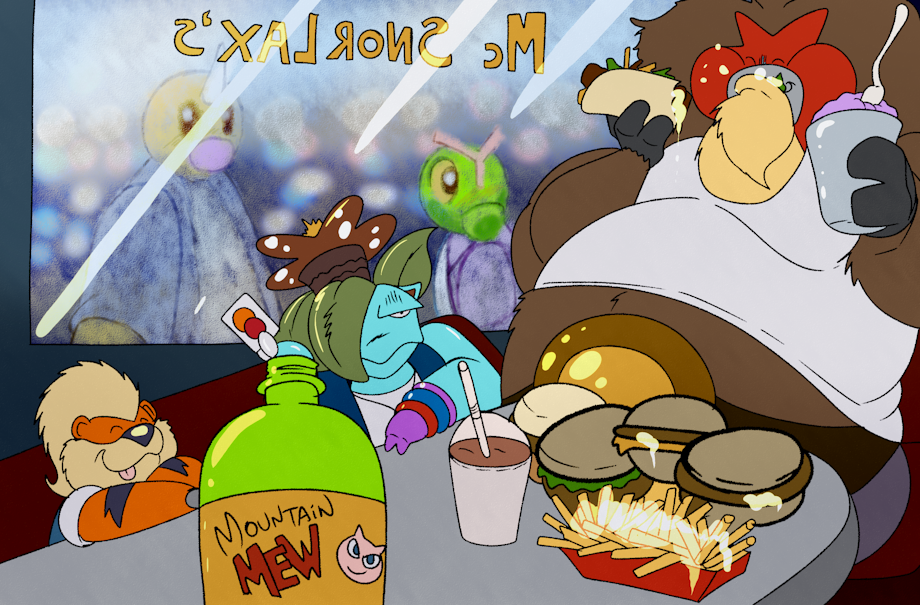 there is only one way to recover after viney's energy drain attack, EAT BACK THE MASS YOU LOST. so, viney, brawl and chris went to the closest mc snorlax and, after a serious scolding from chris, viney had to pay for brawl's dinner. suffice to say.....viney is still paying for that meal. "ok...this is not my idea of an ideal date" said viney grumpily.