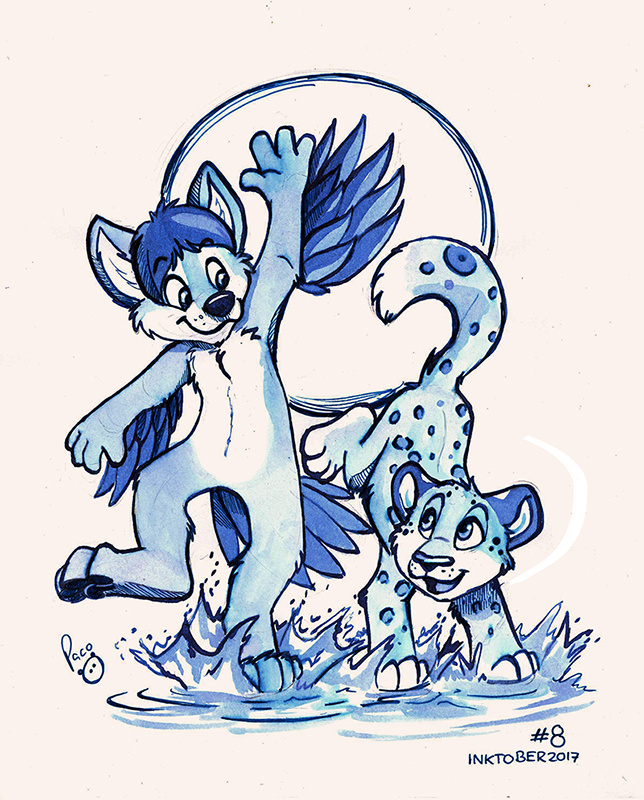 This is acco accophox, a mix of bird-fox, jumping in puddles alongside his spirit companion the snow leopard.