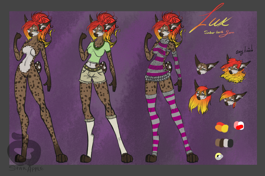 I finished my Lux reference. I got her from cross. like a few days ago. Imma see if it's still raining, maybe go on my walk, and when I get back imma try to draw Shy. Lux is a sabertooth yena :D