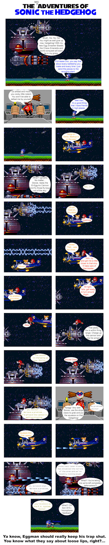 This is an idea I've had for a while after watching the finale of Sonic X, with Eggman going mental with no Sonic around. So, I thought, I bet Sonic would go a little cuckoo with no Eggman around. I started things out in a big way, too. I think I did pretty well with the sight gags. And this issue is one of the first ones where I start my Mighty abuse... You'll see what I mean in a few... Basically, the idea was to treat him like Kenny from South Park Season 1.
