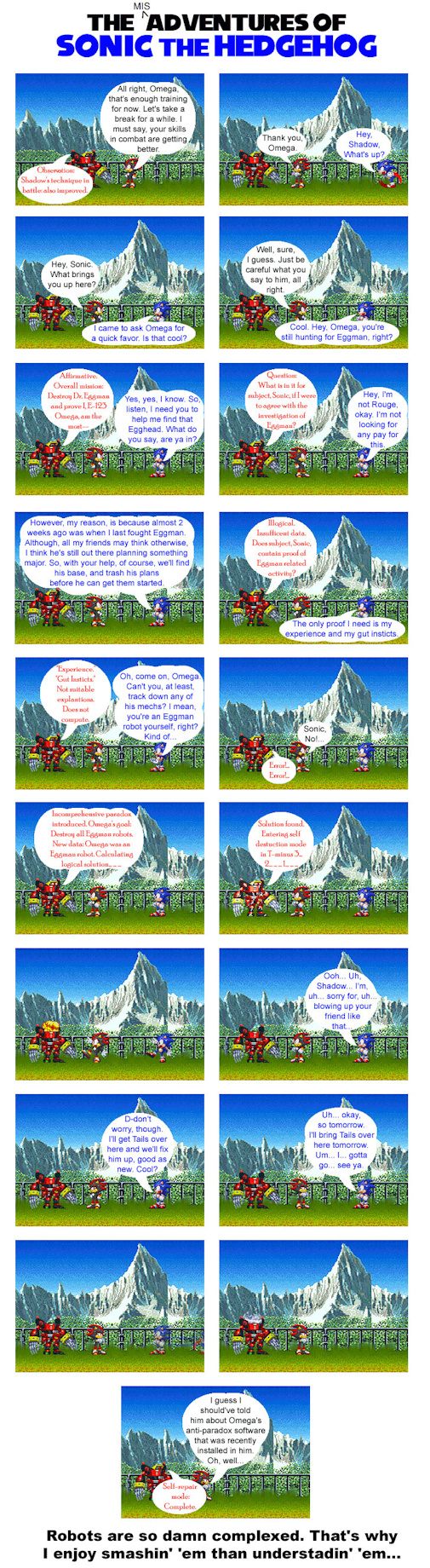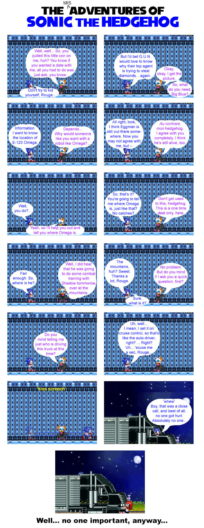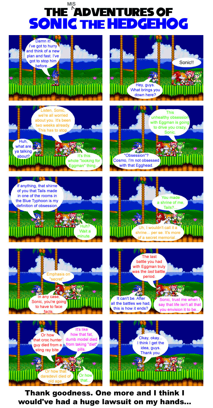 This is an idea I've had for a while after watching the finale of Sonic X, with Eggman going mental with no Sonic around. So, I thought, I bet Sonic would go a little cuckoo with no Eggman around. I started things out in a big way, too. I think I did pretty well with the sight gags. And this issue is one of the first ones where I start my Mighty abuse... You'll see what I mean in a few... Basically, the idea was to treat him like Kenny from South Park Season 1.