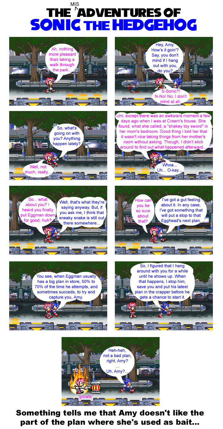 This is an idea I've had for a while after watching the finale of Sonic X, with Eggman going mental with no Sonic around. So, I thought, I bet Sonic would go a little cuckoo with no Eggman around. I started things out in a big way, too. I think I did pretty well with the sight gags. And this issue is one of the first ones where I start my Mighty abuse... You'll see what I mean in a few... Basically, the idea was to treat him like Kenny from South Park Season 1.