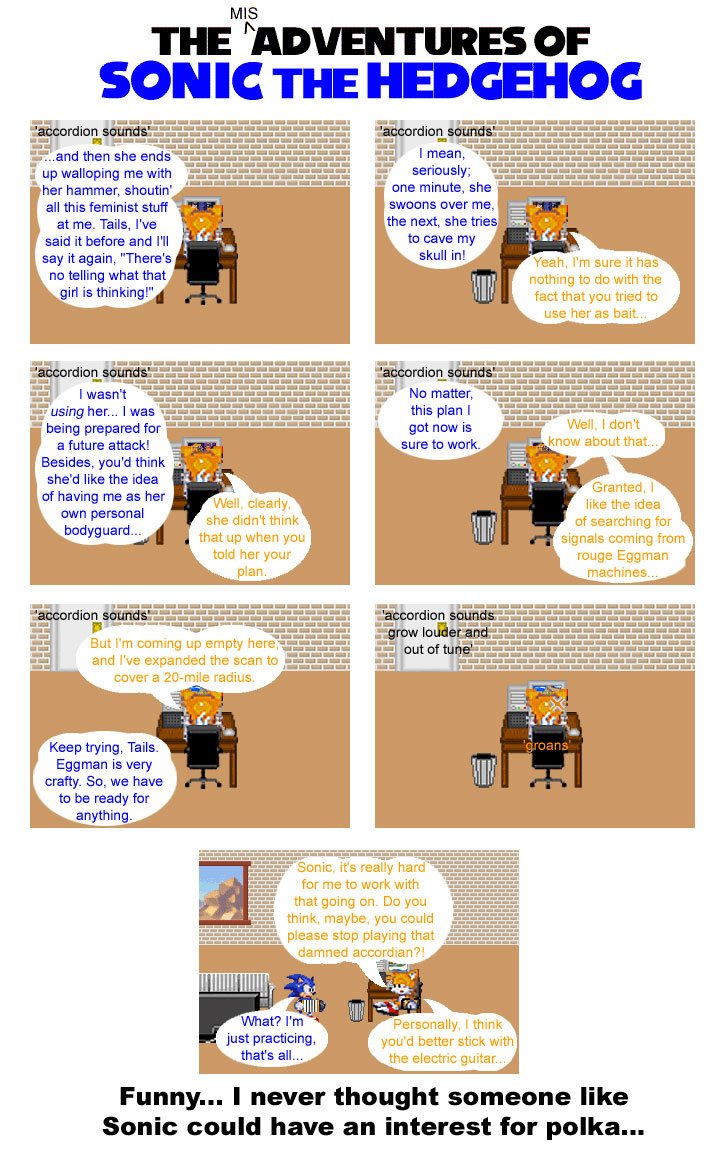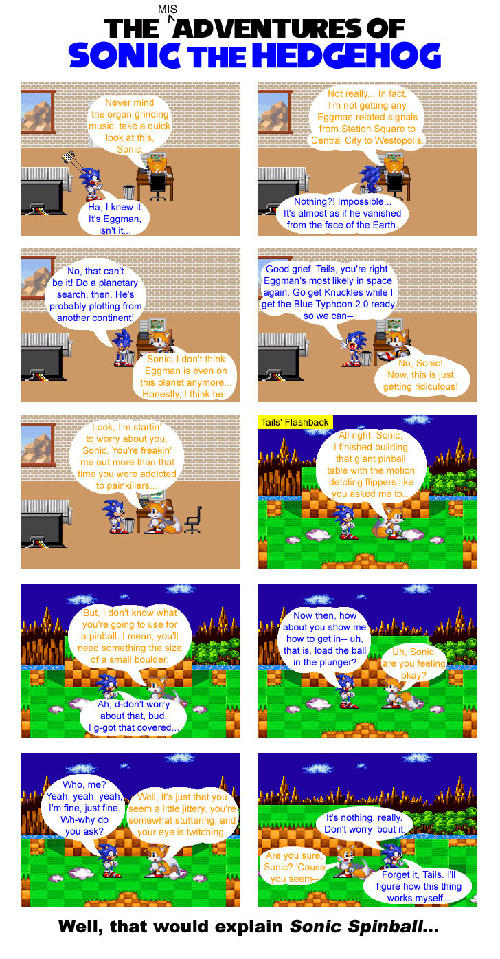 This is an idea I've had for a while after watching the finale of Sonic X, with Eggman going mental with no Sonic around. So, I thought, I bet Sonic would go a little cuckoo with no Eggman around. I started things out in a big way, too. I think I did pretty well with the sight gags. And this issue is one of the first ones where I start my Mighty abuse... You'll see what I mean in a few... Basically, the idea was to treat him like Kenny from South Park Season 1.