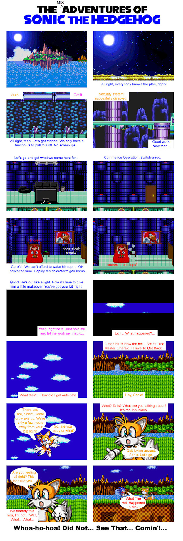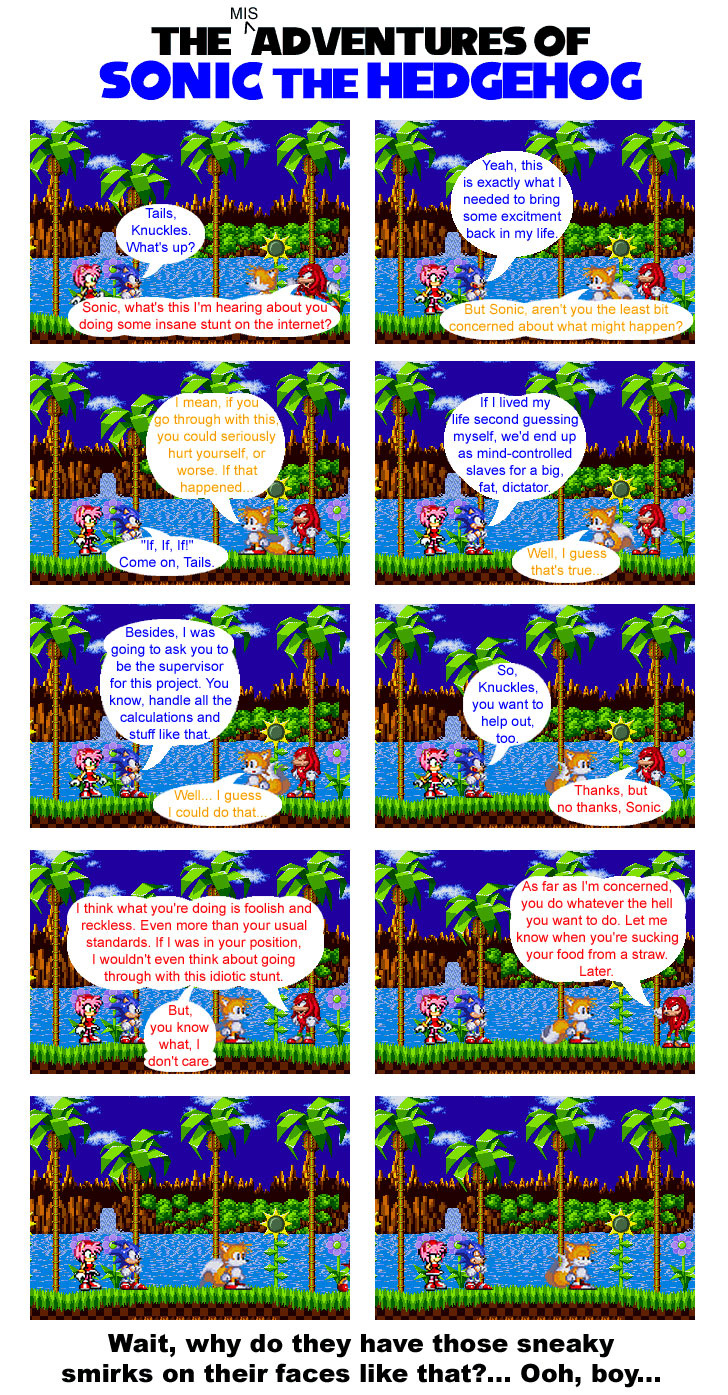 This issue has misdirections like crazy, at least that's what I was intending to do. Once again, I take a jab at Knuckles' intelligence here. Funny that this just happened out of sheer randomness.