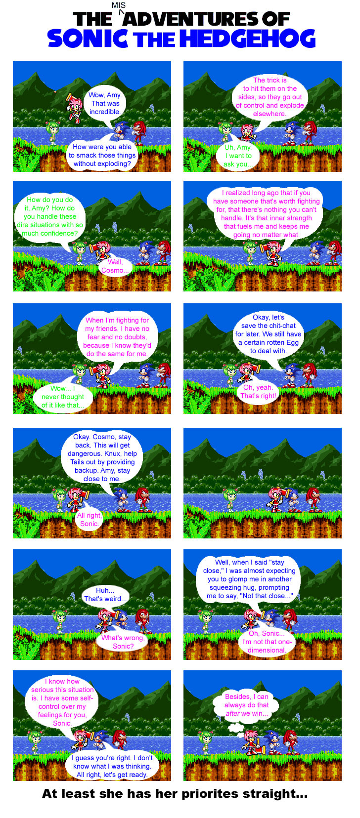 I wanted to use Cosmo more in my comics, but what purpose, since most of the time, the gang is involved in action-type stuff. Then, I remember that one Sonic X episode and I think back to the comic issue when I brought Cosmo back. Thing is, Cosmo is not normally the fighting type... But that's where Amy comes in.