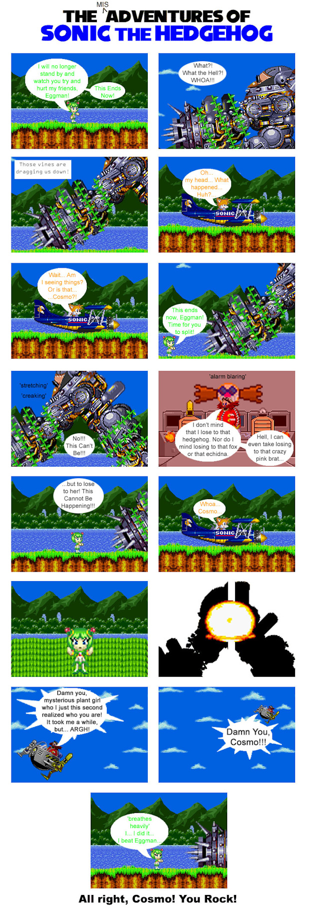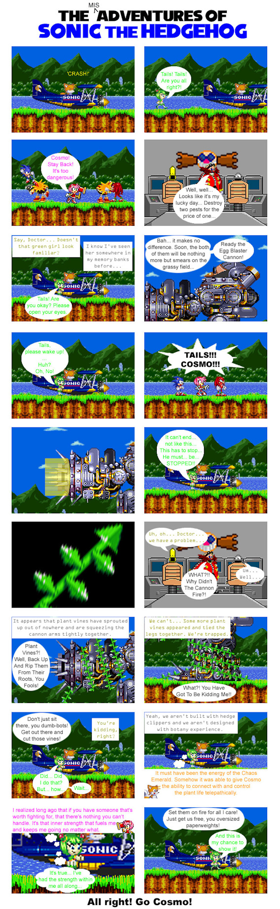 I wanted to use Cosmo more in my comics, but what purpose, since most of the time, the gang is involved in action-type stuff. Then, I remember that one Sonic X episode and I think back to the comic issue when I brought Cosmo back. Thing is, Cosmo is not normally the fighting type... But that's where Amy comes in.