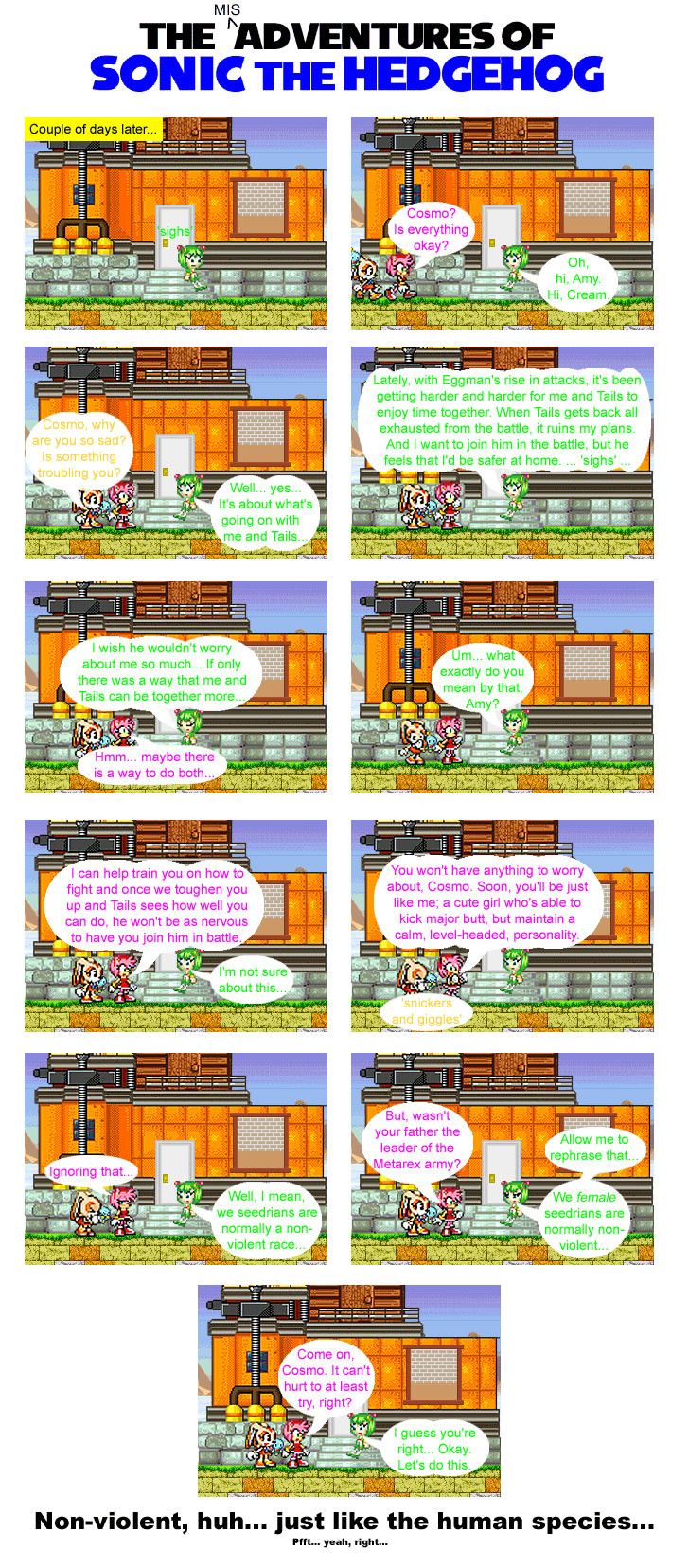 I wanted to use Cosmo more in my comics, but what purpose, since most of the time, the gang is involved in action-type stuff. Then, I remember that one Sonic X episode and I think back to the comic issue when I brought Cosmo back. Thing is, Cosmo is not normally the fighting type... But that's where Amy comes in.