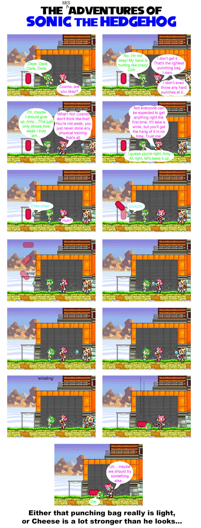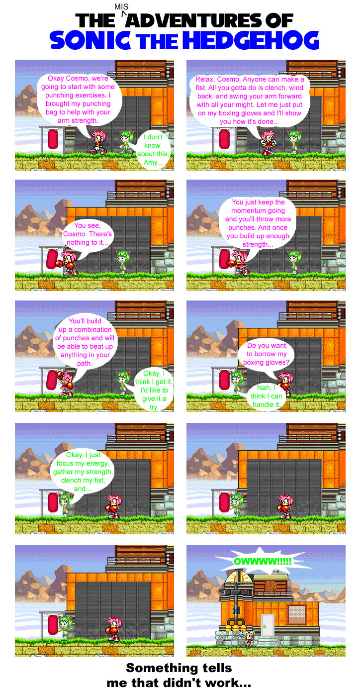 I wanted to use Cosmo more in my comics, but what purpose, since most of the time, the gang is involved in action-type stuff. Then, I remember that one Sonic X episode and I think back to the comic issue when I brought Cosmo back. Thing is, Cosmo is not normally the fighting type... But that's where Amy comes in.