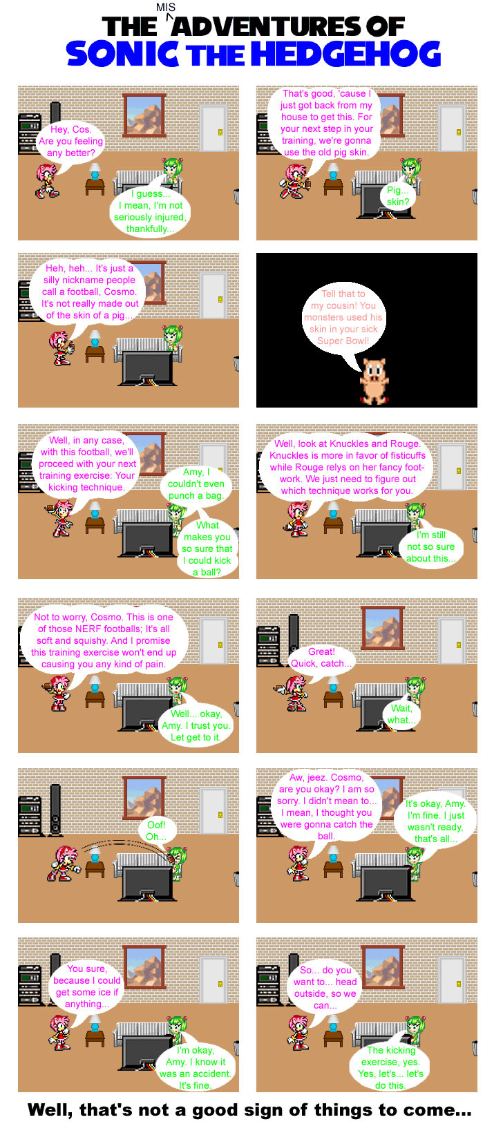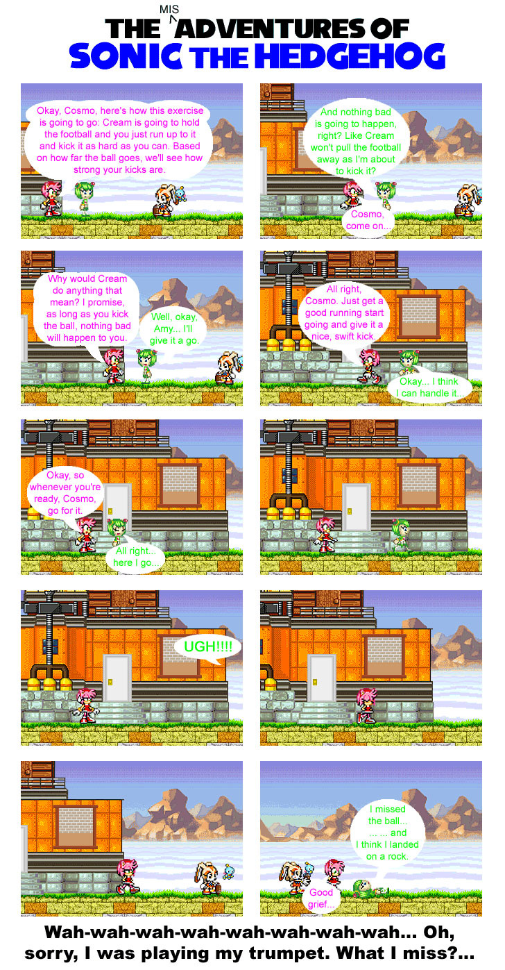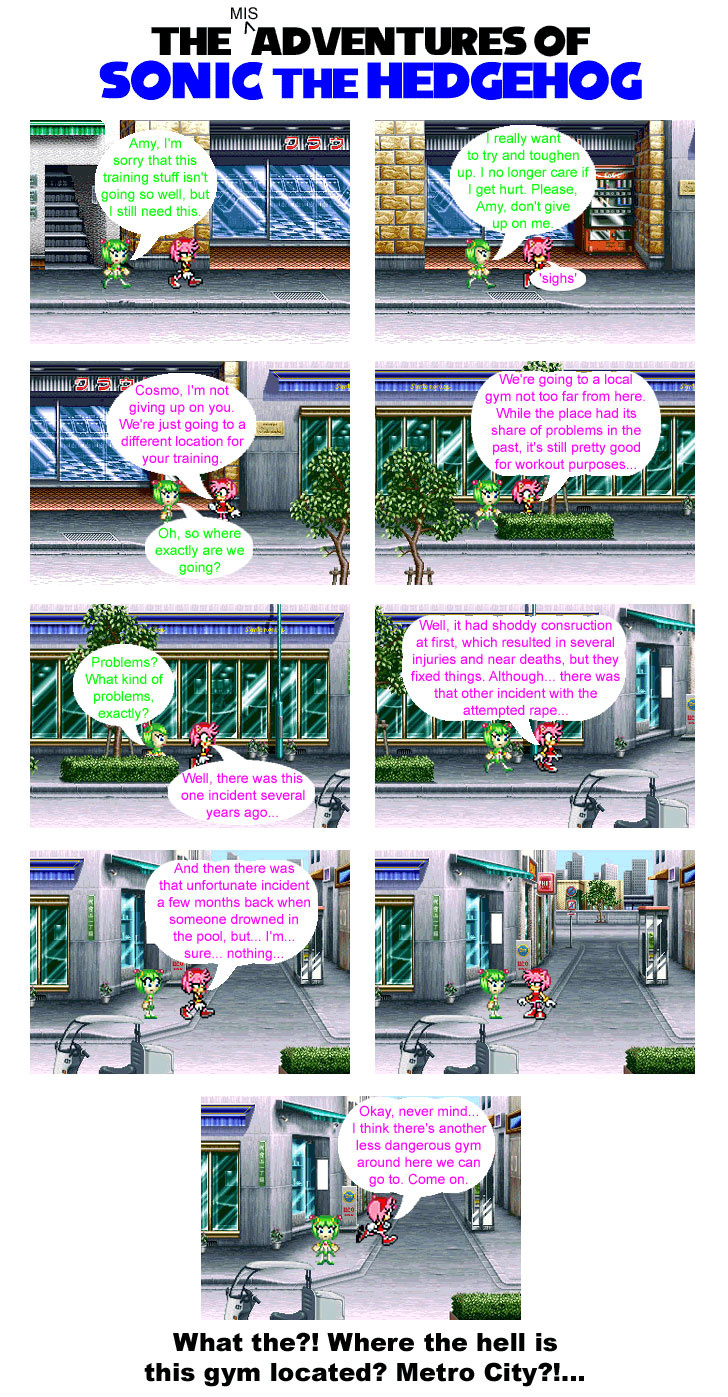 I wanted to use Cosmo more in my comics, but what purpose, since most of the time, the gang is involved in action-type stuff. Then, I remember that one Sonic X episode and I think back to the comic issue when I brought Cosmo back. Thing is, Cosmo is not normally the fighting type... But that's where Amy comes in.