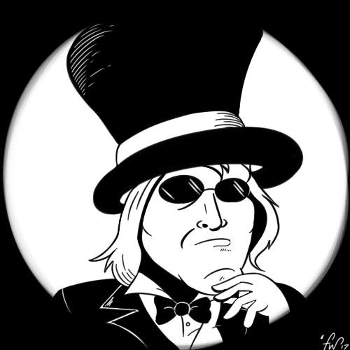 Anyway. This is a black and white sketch of Petty dressed as the Mad Hatter, from his music video Don't Come Around Here No More. I tried to keep it as monochrome as possible to give it a striking, iconic look, but there was a little haze around the framing circle which I felt added some class.