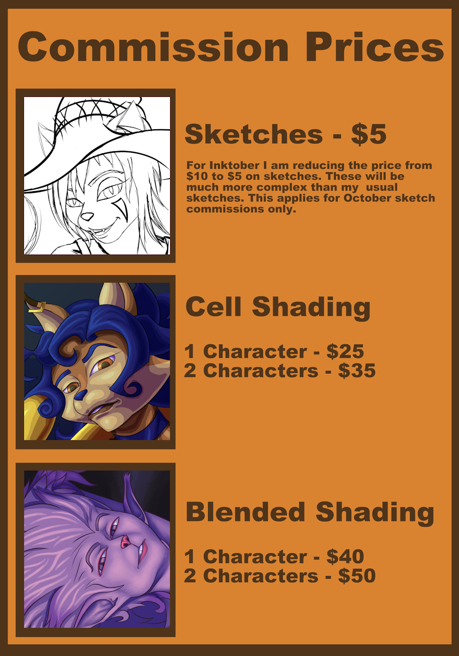 So I don't think I've ever posted a proper price sheet for my commissions, and I think that has been a barrier for some of you to consider commissioning me. I'm sorry and I've finally gotten to posting this one. I'll try and post these every month as well as a general ad for commissions.