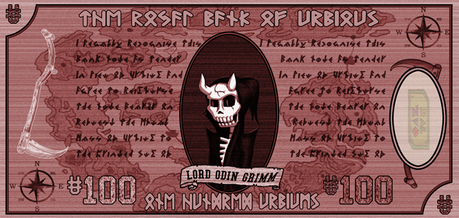 Odin Grimm, (as he appears in my canon) is on the Ʉ100 Ʉrb$ denomination.