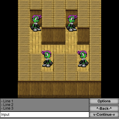 "Back" and "Continue" allow you to scroll through the text in the output box (the thing that says "Line 1, Line 2, Line 3") and on reaching the bottom "Continue" will read the instruction you put in the input box (the things that says "Input").