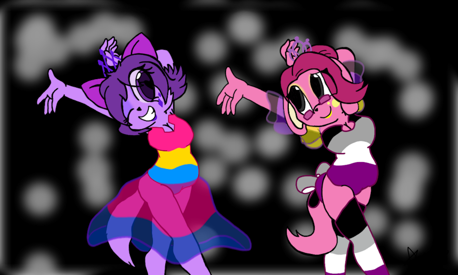 Something I drew for me and my non-binary pal Jay. Each of our fursonas are sporting our flags! On the left is Dopelle Yang with the Pansexual(I'm told i'm pan, i really don't care) and Cis-female colors! On the right is Jay with the Asexual and Aromantic colors! Speedpaint: https://www.youtube.com/watch?v=zItpDVrN5RI