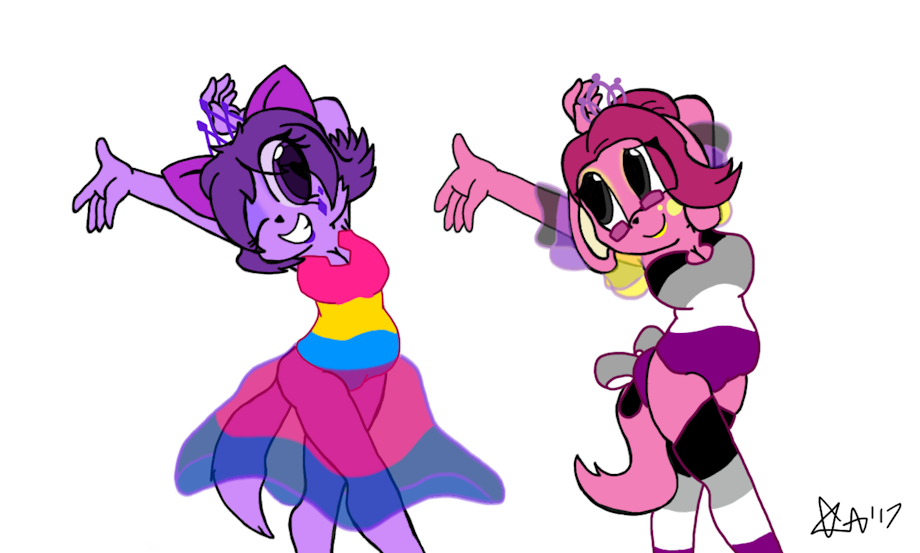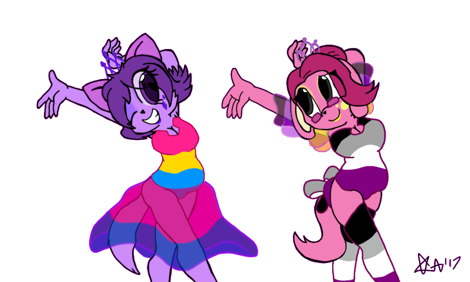 Something I drew for me and my non-binary pal Jay. Each of our fursonas are sporting our flags! On the left is Dopelle Yang with the Pansexual(I'm told i'm pan, i really don't care) and Cis-female colors! On the right is Jay with the Asexual and Aromantic colors! Speedpaint: https://www.youtube.com/watch?v=zItpDVrN5RI