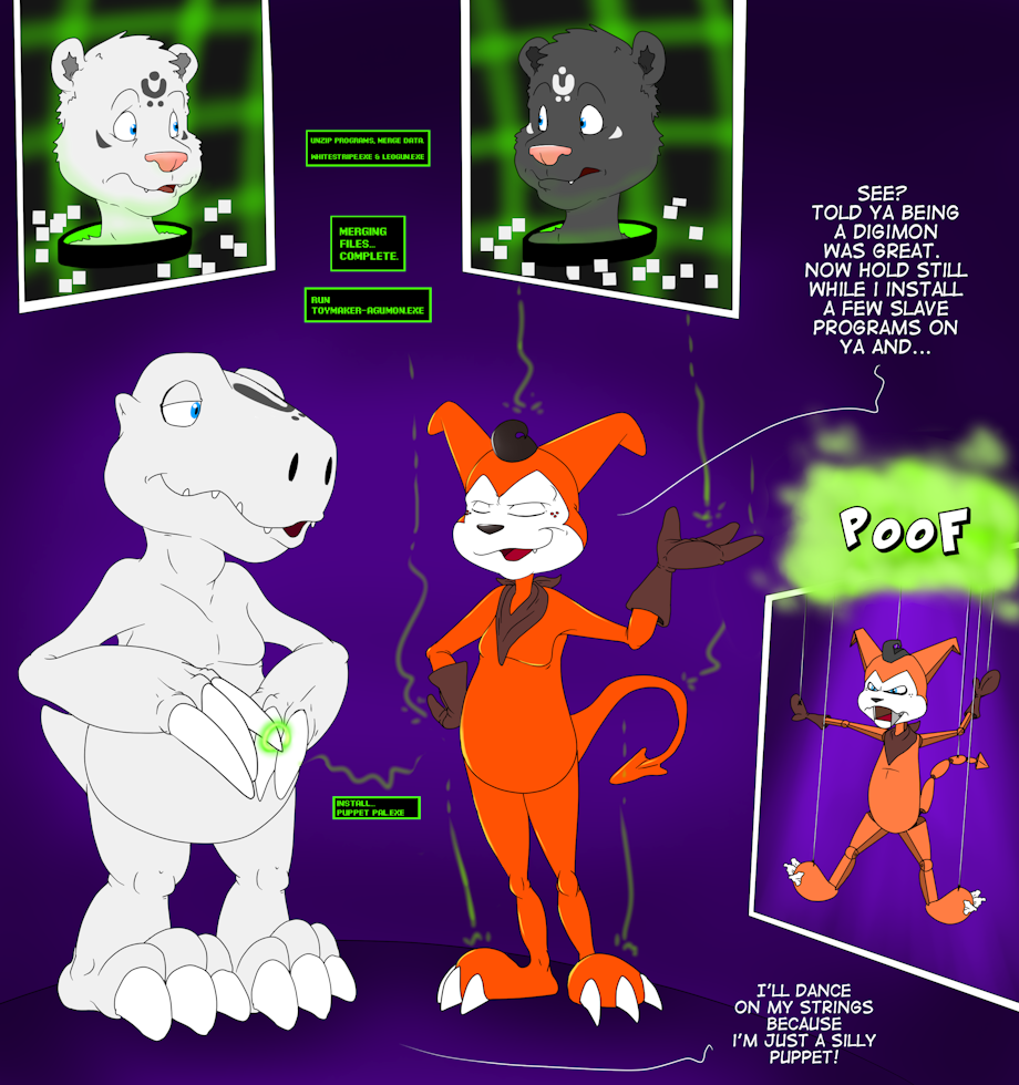 Ya try to be nice, merge a pair of kitties into a digimon, then they don't wait for ya to install the rubber and enslavement programs on them. Noo, they go and turn you into a puppet and make ya dance and tell fart jokes.