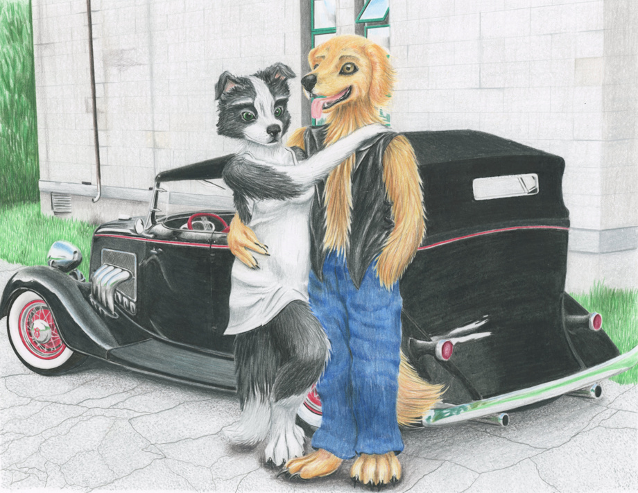 Collie gal and her golden retriever boyfriend, posed next to -her- custom 1933 Ford Phaeton. Because girls who're gearhead/petrolheads or bikers are fucking hot.