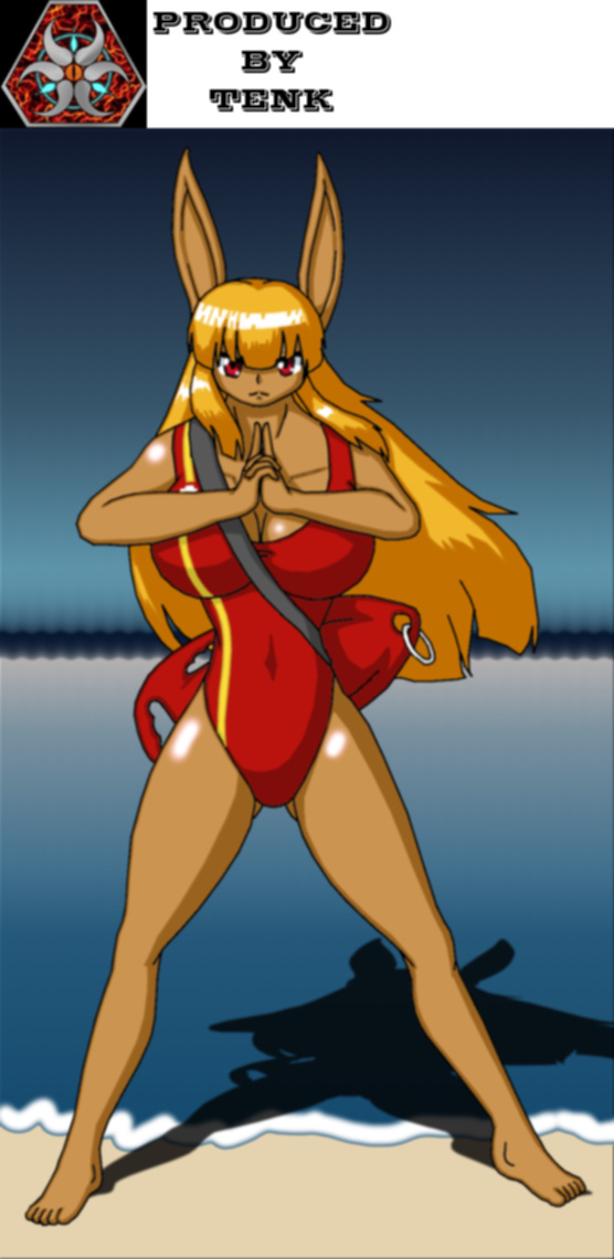 The only thing missing in this picture is her water clones, which I left out since that might double the work for our sponsor. The tiger hand seal she's forming, is the only indication that she's summoned water clones to carry more of her life guard gear.