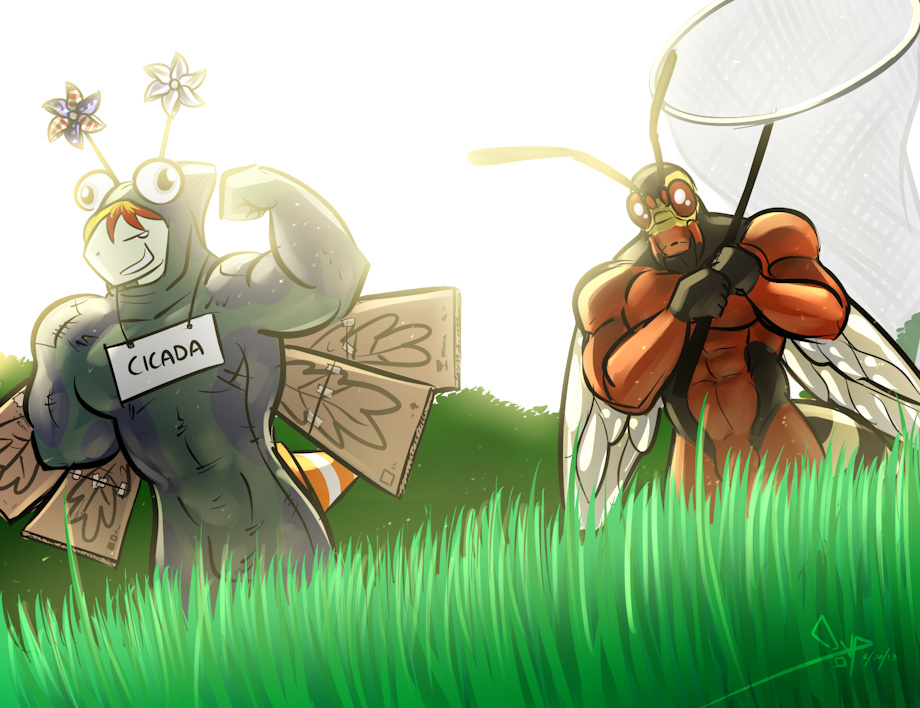 Cyhyrau had jokingly suggested to me the idea of his shark character dressing as a Cicada so that he would get "stung" by the wasp character. A quick sketch was done by Vince, and he two of use had a good laugh about it. Since I liked the idea so much, I decided to ask for a full version of the original sketch that I had seen before, and hopefully Cyhyrau will like the picture as well!