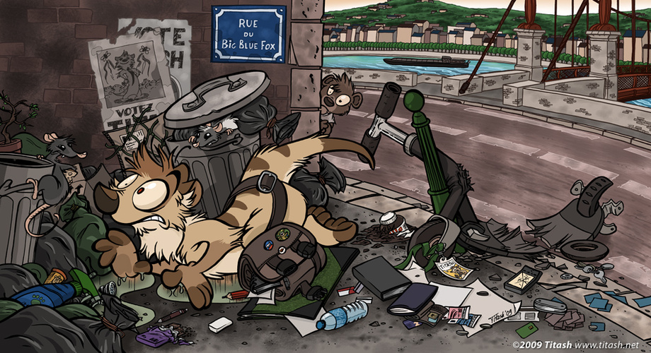 Little scooter ride in Lyon • October 2009 It is a drawing done for my old blog header. I love the scooter, but I'm very clumsy... ^^ When I drawing this pic, Big Blue Fox won my little contest on my Twitter account: He has the right to a filthy street in his name. HeHeHe...